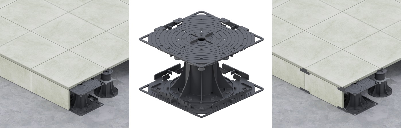 Adjustable pedestals are designed for use every where the base or floor is irregular and must be levelled to a desired height. Using DD Pedestals leveling areas with paving has never been so easy. DD Pedestals are very functional, high quality and are available at very competitive prices. The DD Pedestals System is one of the most innovative and functional systems for laying raised floors. The DD Pedestals system can be used everywhere: under terrace paving, exhibitions, flat roofs, pool surrounds or temporary floors.